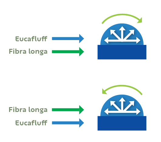 A Eucafluff deve receber sempre a última batida da lâmina do moinho de martelo. É necessário atentar para a rotação do moinho: no sentido horário, a Eucafluff precisa ficar por cima da fibra longa. Já no sentido anti-horário, recomenda-se o contrário.